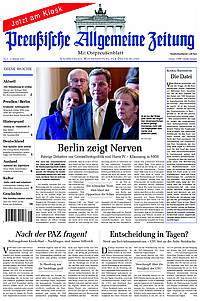 Unseren neuen Lesern dürfen wir die Zeitung kurz vorstellen. Seit fast 60 Jahren steht die Preußische Allgemeine Zeitung für Qualitätsjournalismus der besonderen Art. Die preußischen Tugenden, die unser Land groß gemacht haben, werden von uns noch gepflegt. Wir stehen für einen aufgeklärten Patriotismus, konservative Werte und einen kühlen Blick für das Wesentliche. Preußisch eben! Die Preußische Allgemeine ist aus dem „Ostpreußenblatt“ hervorgegangen, das als Innenteil fortbesteht und fester Bestandteil der Zeitung ist. Diese Zeitung hat gleichsam „Ostpreußen in den Genen“ und bekennt sich stolz dazu! Vor allem aber berichten wir aus konservativer Sicht über Innen- und Außenpolitik, Wirtschaft und Kultur, Medien und über nahezu alle aktuellen Fragen. Weniger Beachtung schenken wir den Themen Klatsch und Tratsch, dem Sport und der Katastrophenberichterstattung. Das überlassen wir der Boulevardpresse und all den anderen Zeitungen, die sich diesen für die Zukunft unseres Landes nicht entscheidenden Fragen immer intensiver widmen. Das journalistische Angebot für konservativ denkende Menschen ist in Deutschland dünn geworden. Viele Blätter haben sich in Themenauswahl und Bewertungen einem linksliberalen Zeitgeist angepasst. Immer mehr große Zukunftsthemen – von der Familien- über die Europapolitik bis zu einer Geschichtsschreibung, die den Nationalsozialismus nicht für den Dreh- und Angelpunkt der deutschen Geschichte hält – haben daher kaum mehr ein publizistisches Forum, das alle Facetten in den Blick nimmt. Die Preußische Allgemeine Zeitung setzt dem etwas entgegen, und unsere Freunde schätzen uns als womöglich eine der letzten gediegen-konservativen Wochenzeitung Deutschlands. Verehrte neue Leser! Wir laden Sie ein, sich nun selbst ein Urteil zu bilden. Wenn wir Ihr Interesse geweckt haben, so finden Sie auf unserer Internetseite www.preussische-allgemeine.de alle weiteren Informationen einschließlich des Angebots zum kostenlosen vierwöchigen Probebezug „frei Haus“. Willkommen bei der PAZ!