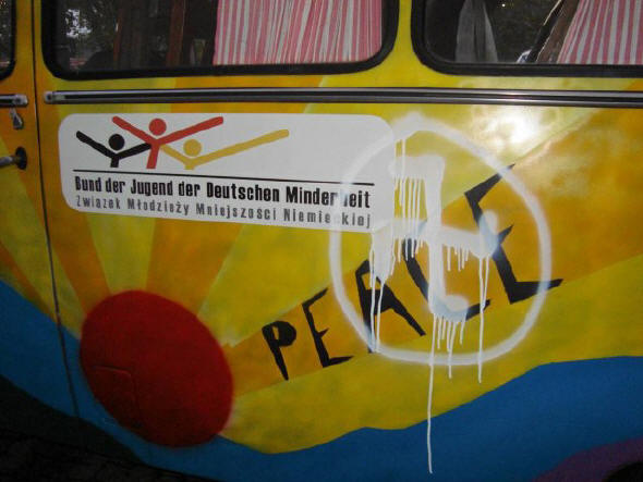 Hakenkreuzattacke auf deutsche Minderheit in Polen Oppeln/Polen - Zwei Unbekannte haben am Wochenende am Gebäude der deutschen Minderheit im südpolnischen Oppeln eine Hinweistafel zerstört und das Auto eines Vereinsmitarbeiters mit einem Hakenkreuz beschmiert. Nach polnischen Medienberichten vom Montag beobachtete eine Zeugin zwei vermummte Männer bei der Tat, die auch einen Schlagring mit sich führten. Die Polizei ermittelt. "Wir sind sehr traurig, dass so etwas passieren konnte. Unser Ziel ist es, den Gedanken der Toleranz in der Gesellschaft zu verbreiten", sagte eine Sprecherin der Minderheit. Nach ihren Angaben war es nicht das erste Mal, dass die Deutschen in Schlesien zum Ziel von Hassattacken wurden. Auch in anderen Fällen seien bereits Hinweistafeln der Minderheit zerstört und Hauswände beschmiert worden. In Polen leben nach unterschiedlichen Angaben zwischen 150.000 und 300.000 Mitglieder der deutschen Volksgruppe, die großenteils nach dem Zweiten Weltkrieg trotz Fluchtwelle und Vertreibungen im Land blieben. Seit 1991 genießen sie in Polen volle Minderheitenrechte nach internationalen Standards. Unter anderem ist die Minderheit bei Wahlen von der Fünf-Prozent-Hürde befreit und mit einem Abgeordneten im Sejm vertreten, dem polnischen Parlament.