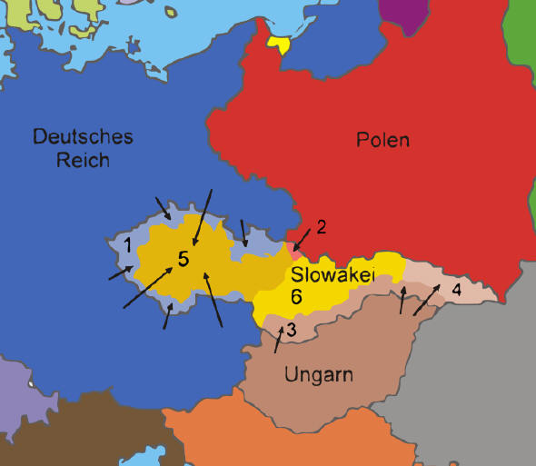 Gebiete an das Deutsche Reich Die Vorgeschichte zum Münchener Abkommen beginnt mit dem Untergang Österreich-Ungarns und der Ausrufung der Tschechoslowakischen Republik (ČSR) im Jahre 1918. Der Wunsch der deutschen Altösterreicher im Sudetenland bei Österreich zu bleiben, wurde ihnen auf der Pariser Friedenskonferenz und von den Tschechen das Selbstbestimmungsrecht verwehrt. Es wurde ihnen die Autonomie der mehrheitlich deutschen Gebiete im Rahmen der ČSR nicht zugestanden, aber es begann eine Tschechisierungspolitik durch Austausch der Staatsbeamten mit Tschechen, die mit ihren Familien ins Sudetenland kamen. Eine Folge dieser nationalen Unterdrückung führte zur Gründung der deutschen Sammelbewegung Sudetendeutsche Partei (SdP) unter Konrad Henlein und dem Aufstieg zur stimmenstärksten Partei im Prager Parlament. Trotzdem waren die ČSR-Behörden in der Schul- und Arbeitspolitik – unter den Deutschen war eine vierfache Arbeitslosigkeit – nicht bereit den Sudetendeutschen die nationale Selbstverwaltung zu gewähren. Nun machte das Deutsche Reich unter Adolf Hitler Druck und setzte sich für die unterdrückte Volksgruppe ein. Er brachte Großbritannien, Frankreich und Italien in München an den Verhandlungstisch, um die Fehler von St. Germain 1919 zu reparieren. In der Prager Abtretung gab auch die ČSR zur Abtretung der Gebiete ihre Zustimmung und so konnten im folgenden Münchener Abkommen am 29. September 1938 die Durchführungsbestimmungen beschlossen werden: Vom 1. bis 10. Oktober 1938 sollten die ČSR-Behörden an die Behörden des Deutschen Reiches die Übergabe vollziehen – was friedlich geschah. Die Unterzeichner waren: Neville Chamberlain (GB), Édouard Daladier (F). Benito Mussolini (I), Adolf Hitler (DR). Die Tschechen wünschten keine Volksabstimmung, da sie sonst sofort auch von den Slowaken, Polen, Ungarn und Ukrainern verlangt und die Tschechoslowakei über Nacht zu einem kleinen „Tschechien“ reduziert worden wären. Dieser Tatbestand wurde bereits bei den Friedensverhandlungen von St. Germain erkannt. Schlecht für die Sudetendeutschen war die Weiterentwicklung: ein halbes Jahr später als Hitler am 15. März 1939 die „Resttschechei“ rechtswidrig besetzte: am 13. und 14. März hatten sich die Karpato-Ukraine und die Slowakei von der Fehlkonstruktion ČSR abgespalten. Hitler gründete das Protektorat Böhmen und Mähren wo eine tschechische Verwaltung unter deutscher Vorherrschaft entstand.