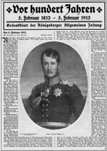 "Alles ... müsse sich bewaffnen" Vor 200 Jahren beschloß die ostpreußische Landesversammlung den Kampf gegen Napoleon Bonaparte Da der Eroberer Napoleon Bonaparte Franzose und nicht Deutscher war, vermag es kaum zu überraschen, daß die vierteilige Filmbiographie, die unlängst im öffentlich-rechtlichen Zweiten Deutschen Fernsehen zur besten Sendezeit über ihn zu sehen war, geradezu das Bild eines Sympathieträgers zeichnete, der geläutert durch die Erfahrungen in Rußland Europa den Frieden erklärt. Expressis verbis heißt es seitens des ZDF über Christian Clavier, den Darsteller des Franzosenkaisers in dem Mehrteiler, daß ihn "nicht nur seine "Asterix"-Rolle als Darsteller nationaler Heldengestalten qualifiziert". Weiter heißt es in der ZDF-Darstellung des französischen Schauspielers, daß er "die Ticks und Macken seiner Personen als kleine menschliche Schwächen" darstelle. Der vom ZDF dem Zuschauer präsentierte Napoleon ist damit im Grunde auf den Punkt gebracht: ein nationaler Held mit Schwächen. Da eine Darstellung der napoleonischen Zeit denkbar ungeeignet ist, das Klischee vom militaristischen, expansionistischen Preußen zu bedienen, kann es ebensowenig verwundern, daß dieser Staat in dem Vierteiler fast keine Rolle spielt. Die Darstellung der Preußen ist mehr oder weniger reduziert auf einen preußischen Kriegsgefangenen, der sich von französischen Soldaten hat erwischen lassen, und eine preußische Königin, die im Angesicht der drohenden Niederlage fluchtartig ihre Truppen verläßt. Symptomatisch für die aktuelle Geschichtspolitik ist auch die Behandlung beziehungsweise Nichtbehandlung der deutsch-russischen Allianz bei der Befreiung des europäischen Kontinents von der Fremdherrschaft der kontinentalen Flügelmacht im Westen. Diese Konstellation während der Befreiungskriege ist halt denkbar ungeeignet als Vorbild und historische Legitimation für die deutsche Westbindung der Gegenwart. Die Westintegration galt in Deutschland jedoch nicht zu allen Zeiten als Bestandteil der Staatsräson und so betrachtete sich beispielsweise das deutsche Kaiserreich weniger als integraler Bestandteil des Westens denn als eigenständige mitteleuropäische dritte Kraft, als Brücke zwischen Ost und West. Entsprechend gering waren seine Hemmungen, sich in die Tradition des Befreiungskampfes mit den Russen gegen die Franzosen zu stellen. Ausgiebig wurden die Freiheitskriege gewürdigt. Dieses galt auch für die Medien. Ein Beispiel hierfür ist das Gedenkblatt der "Königsberger Allgemeinen Zeitung" zum 100. Jahrestag des Beginns der ostpreußischen Landesversammlung, auf der die Beteiligung der Provinz am Kampf gegen Napoleonfrankreich beschlossen wurde. Auf dem Gedenkblatt steht zwar ausdrücklich "Nachdruck verboten", doch erlaubt sich das Ostpreußenblatt, das sich als Preußische Allgemeine Zeitung als ideeller Nachfolger der "Königsberger Allgemeinen Zeitung" betrachtet, an dieser Stelle einen größeren Auszug wiederzugeben.